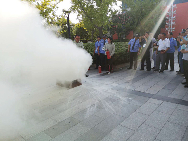 消防隊(duì)員現(xiàn)場(chǎng)講解滅火器使用原理,并組織物業(yè)人員、企業(yè)負(fù)責(zé)人現(xiàn)場(chǎng)操作。